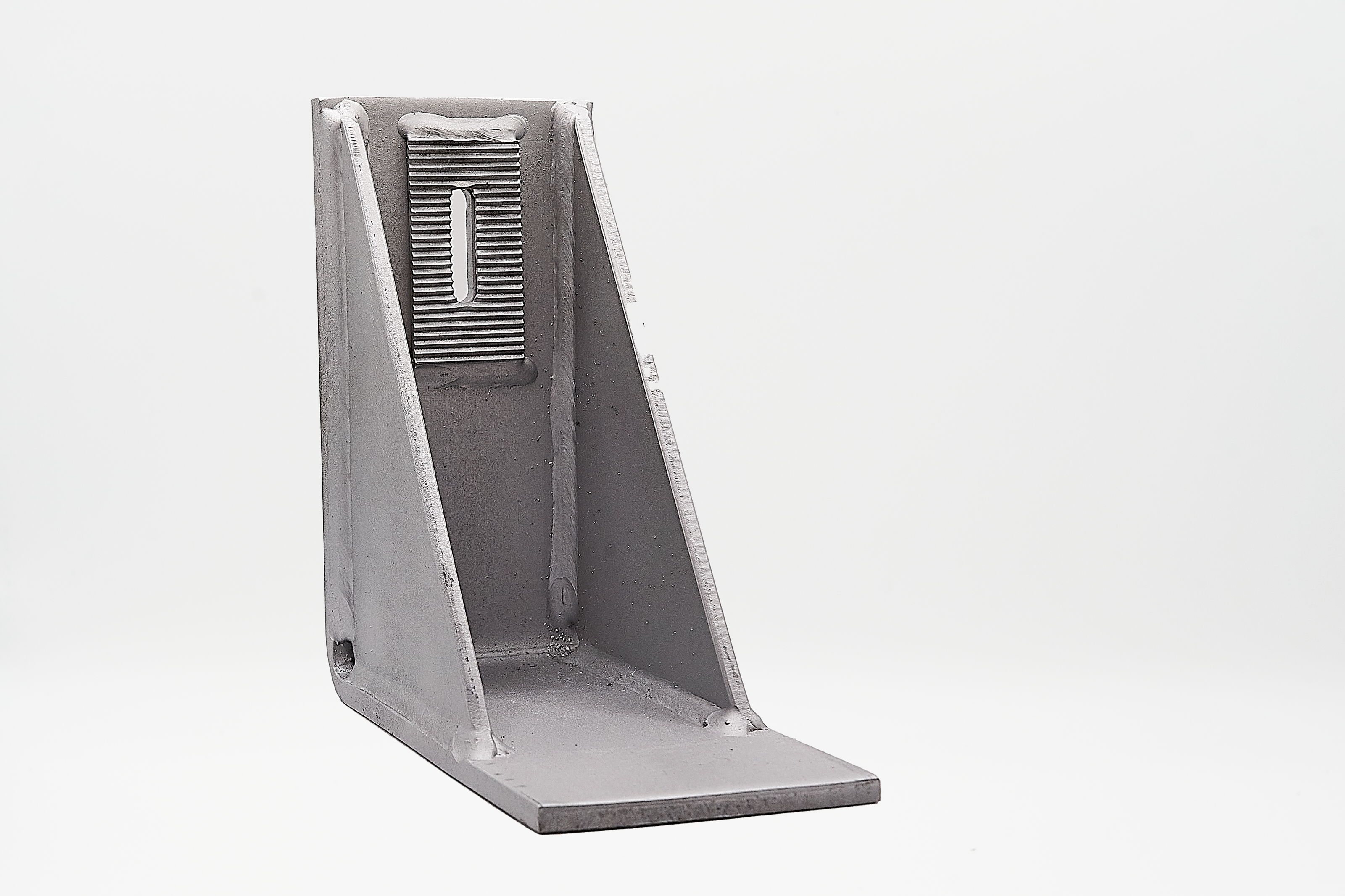 A right-angled support bracket with a vertical mount slot with welded serrated washer to allow for vertical adjustment and welded sides for added strength.